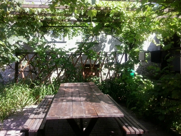 Размещение: здание коттеджного типа, имеется зеленый дворик, кухня, телевизор и холодильник в столовой. Двор благоустроен. Во дворе есть уютный уголок под навесом со стационарным мангалом. Даже в жару здесь свежо и прохладно. За большим удобным столом вы приятно проведете время в своей компании. Если Вы захотите тишины и уединения - во дворе есть отдельные зоны отдыха со столиками и стульями в тени виноградных листьев.